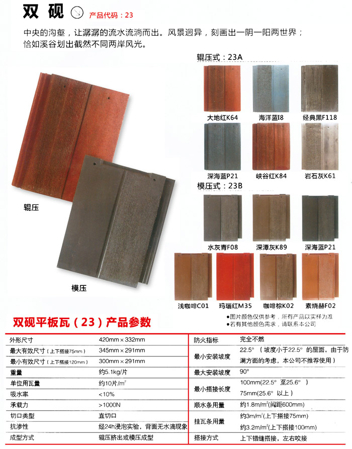 混泥土瓦的瓦配件有普遍的挑選范疇。水泥瓦可采用環(huán)形屋脊瓦、梯狀屋脊瓦、山墻邊瓦(別稱山墻房檐或屋脊)、平屋脊頭、斜屋脊頭、邊瓦頭(別稱房檐)、高壓避雷器無線天線屋脊瓦、雙重屋脊瓦、三向屋脊。瓷磚、四向屋脊瓷磚、管溝瓷磚、不銹鋼板排污溝、墻壁和瓷磚接縫處。聯(lián)接板、墻磚房檐支撐點密封性板(墻磚下)、S墻磚密封性板、骨墻磚接縫處(S墻磚上密封性板)、百葉窗簾等。