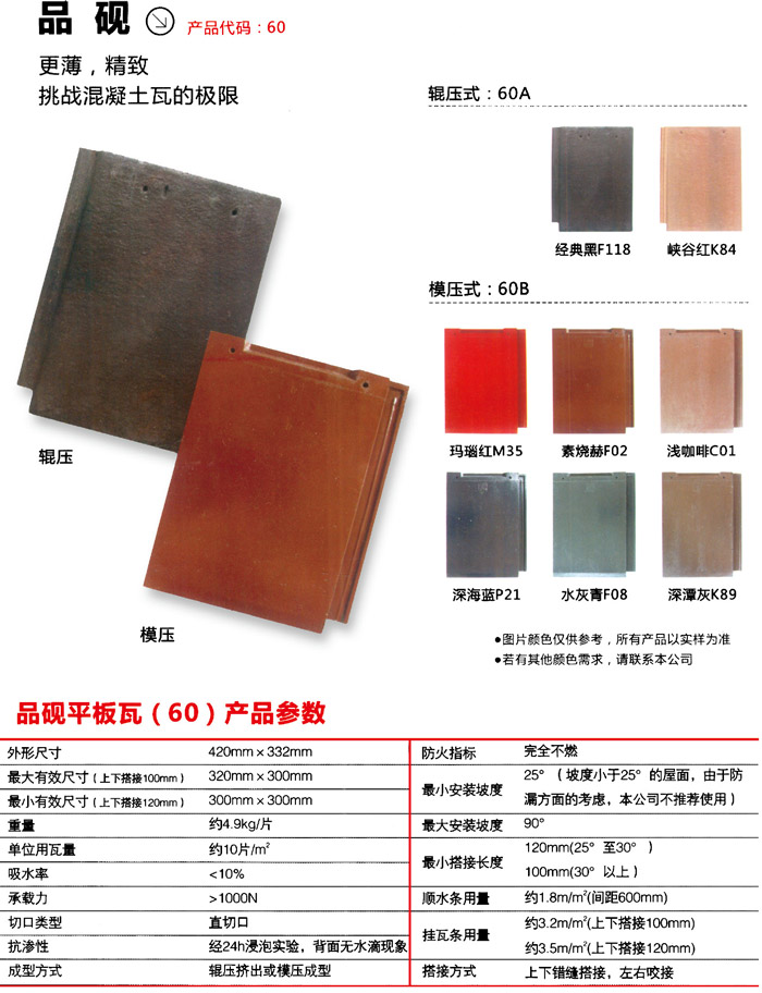 材料。先分辨著色層是混凝土還是漆料?;炷嗤敛释呱仙绞接卸?;其一:彩瓦著色層是混凝土與有機(jī)顏料、環(huán)氧樹(shù)脂及二氧化硅石料所組成,薄厚在0.5毫米上下。它粘合力強(qiáng)(與瓦另外制做)耐老化一般,歷經(jīng)一定階段的風(fēng)吹日曬非常容易退色。舊式制瓦和中小型瓦廠絕大多數(shù)用這類方式上色,緣故是低成本;其 二:選用漆料噴漆,噴漆上色艷麗,一般噴漆干膜薄厚約在35um之上,經(jīng)歷十?dāng)?shù)年的應(yīng)用,久不掉色不脫落。